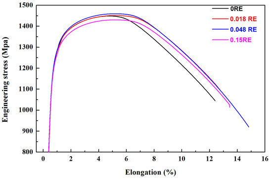 The representative engineering tensile stress-strain curves in response to different additions of RE.