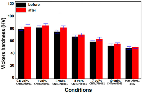 The relative densities of the sintering specimens prepared according to compaction pressure changes were measured. The relative densities of the composite materials with MWCNT contents of 1, 3, 5, 7, and 10 vol % MWCNTs were increased by 7, 5, 4, 3, 2, and 0.3%, respectively, when compared with Al6061 alloy (compaction pressure of 1000 MPa and sintering temperature of 620 °C). The specimen formed under the compaction pressure of 1000 MPa was selected since its relative density reached a minimum value of 80%, when the MWCNT contents were 1–10 vol % under the compaction pressure of 1000 MPa. Considering high compaction pressure can cause die damage, or adhesion between the die and the material, a graphite lubricant was used during the experiment. As is widely known, an increase in compaction pressure removes specimen air pores and reduces billet volume, thereby increasing relative density. Figure 5 illustrates the changes in hardness before and after sintering the billet. The hardness gradually decreased as MWCNT content increased from 1 to 10 vol %. It was also observed that the density of the billet processed by sintering increased by ~5% as compared with that of the billet without sintering.