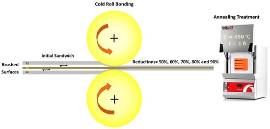 After the CRB process, samples had the dimensions of 15 mm (L) × 10 mm (W). These specimens were annealed in a heat treatment furnace at 450 °C for 60 min. To avoid oxidation, samples were covered with alumina powders. In this step, the actual MIL-composites were formed as a result of diffusion processes. The schematic of the entire process (CRB and annealing) is illustrated in Figure 1.