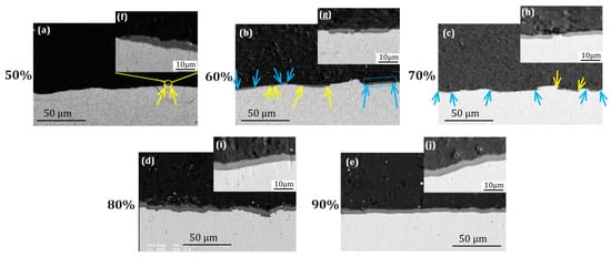 Figure 2 shows the backscatter contrast images of the Al-Ni laminated composites, which were fabricated by the CRB process with 50%, 60%, 70%, 80%, and 90% reductions and subsequent annealing at 450 °C for 60 min. It can be seen that a new phase has formed at the Al/Ni interface. The micrographs of Figure 2a–e exhibit that the phase formation is affected by the level of strain. As can be observed in Figure 2a,f, 50% thickness reduction resulted in only some scarce nuclei of the new phase. However, 90% reduction resulted in a complete layer of intermetallic phase(s) (Figure 2e,j). The nucleation of the new phase at the interface of Al and Ni appears to indicate that a threshold strain for nucleation of approximately 50% reduction is required. Increased rolling reduction involves increased plastic strain, and causes the formation of an interface phase with the morphology of a continuous layer. Higher strain level results in increased defect density, especially sub-boundaries in metals with high stacking fault energy []. These high-energy defects are preferred sites for intermetallic phase nucleation, and thus, the nucleation rate increases with the increasing of strain. As a result, the phase nuclei coalesce during growth causing a continuous and homogenous layer after annealing of sample R90.