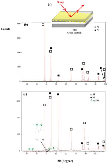 (a) Schematic representation of the tilted cross-section subjected to X-ray diffraction; X-ray diffraction patterns in (b) 50% and (c) 90% reduced samples, after cold roll bonding and subsequent annealing at 450 °C for 60 min. Only in 90% cold rolled sample the Al3Ni intermetallic phase was identified, whereas in the 50% rolled sample the base metals Al and Ni were identified solely.