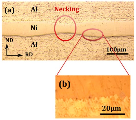 Optical micrographs observed on the TD section of the Al-Ni strip subjected to 90% reduction, before annealing; (a) necking of the Ni layer and (b) jagged Al/Ni interface.