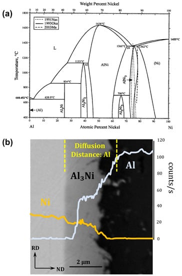 (a) The Al-Ni phase diagram [], (b) typical energy dispersive spectrometry line profile of Al and Ni across the interface, observed in the RD-ND plane after 70% cold roll bonding and annealing at 450 °C for 60 min.