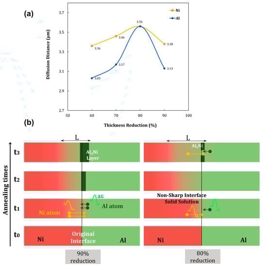 Atomic diffusion distances, estimated from the EDS line scans, of Ni and Al versus thickness reduction are given in Figure 6a. The results show that the diffusion distances of Al (xAl) and Ni (xNi) increased with the increasing reduction up to 80%, but decreased after 90% reduction. The higher reduction of 90% reduces the interface barrier activation energy of diffusion, which gives rise to rapid interdiffusion of atoms and the formation of Al → Ni solid solution at early annealing time. Subsequently, thermal energy and rest stored energy in cold-worked constituent layers supply the activation energy of Al3Ni nucleation at much shorter annealing times in comparison with the material rolled to a reduction of 80% and lower. The nucleation of Al3Ni from solid solution occurs simultaneously with interdiffusion of atoms into the opposite lattice. As the diffusion barrier in sample R90 is lower than in sample R80, because of the better and more homogeneous bonding strength, a continuous intermetallic layer can be formed more readily in sample R90. As diffusion of the component atoms through the compact intermetallic layer is slower and more difficult than diffusion through the opposite base metal lattice, it explains the reduced diffusion distances in sample R90 as compared to sample R80. In sample R80 the intermetallic layer is segmented and leaves open gates for inter-diffusion of Ni and Al, explaining the larger diffusion distances. This is schematically proposed in Figure 6b, which shows the formation of solid solution and the Al3Ni phase in samples R80 and R90 at the same annealing time. It can be said that the diffusion distance is the result of two opposing tendencies: (i) the activation energy imposed by the interface barrier, which reduces with increased rolling reduction (cf. Figure 6b) and (ii) the activation energy imposed by the newly formed intermetallic layer itself, which increases with increased rolling reduction.