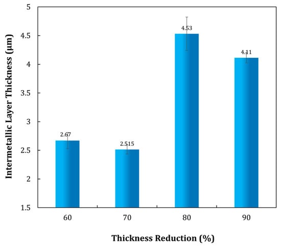 Intermetallic layer thickness dependence versus cold roll bonding reduction after annealing at 450 °C for 60 min.