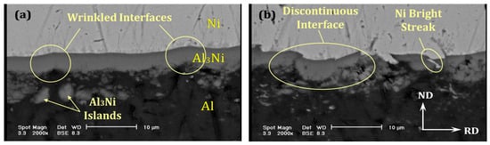BSE images observed on the TD section of the 80% cold rolled and annealed sample; (a) wrinkled and (b) discontinuous interface. In (b) bright streaks are observed of pure Ni diffusion through thermal stress cracks of the brittle Al3Ni intermetallic layer.