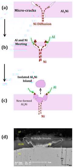The above-mentioned mechanism of intermetallic phase formation implies that in the annealing step, an Al-Ni solid solution was formed before or even during the nucleation of intermetallic compounds. A redistribution of atoms is required to obtain the Al3Ni stoichiometry [,], which only could occur at elevated temperatures during annealing. Ultimately, the intermetallic compound was formed by nucleation and growth and an Al-Ni-based metal-intermetallic laminated composite was produced.