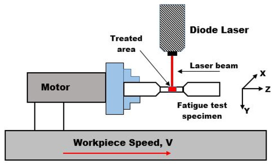 The improvement of mechanical strength and fatigue life of structural components is one of the most important objective to be achieved in order to satisfy the stringent requirements of today’s designers and producers [1,2,3]. Designing, monitoring, and providing innovative technological solutions aimed at improving the mechanical properties and in particular the fatigue life of steel components are therefore of fundamental importance [4,5]. During the last decades, many different approaches to improve the fatigue life of steels were proposed, i.e., heat and mechanical treatments, surface alloying, overlying coatings, etc. Among them, surface treatments on steel components have different applications in many technological domains. Generally, they are applied to obtain an improvement of hardness, wear resistance, and corrosion properties. These treatments permit steel components to meet the demand of high performance (load, pressure, wear, etc.) of the industrial world [6]. However, these processes, while having many advantages, are often expensive, time consuming, and do not allow a selective treatment of small portions of the component. In this respect, the use of lasers for the thermal surface treatment of steel components has appeared as an innovative solution since it offers selectivity, leaving areas not directly exposed to laser radiation unaltered, making process control very easy and facilitating manipulation [7,8,9,10]. A high power laser beam may be directed onto a surface using very precise multi-axis handling systems. A laser makes it possible to achieve extremely localized heating areas, remaining the bulk of the workpiece at the lower temperatures. The low temperature mass of the workpiece act as a heat sink during the cooling phase, allowing cooling rates of 103–104 K/s suitable for the martensitic transition, resulting in increased wear and fatigue resistance of the component [11]. Moreover, when compared to other solutions, laser hardening causes little deformation of the part thanks to precise, controlled, and low heat input, thus virtually eliminating post-machining processes. In addition, laser sources can be applied to a wide range of materials [12,13,14,15,16]. All cast iron, medium-carbon steel, and tool steel are amenable to the laser hardening process [11], and even low carbon steels are amenable because of the rapid heating and cooling rates generated by the laser radiation [17]. On the other hand, the main disadvantage compared to conventional technologies is found with the effects of back tempering induced by multiple passes. In fact, a multi-pass hardening process is characterized form back-tempering phenomena. Every laser track re-heats the area previously heated, inducing a transformation of the martensite into tempered martensite characterized by lower hardness. Thus, the back tempering phenomena leads to a lack of uniformity of the surface mechanical properties [8,18]. A High Power Diode Laser (HPDL), different from other sources, is well suited to surface hardening. In fact, the HPDL beam profile ensures a uniform heating of the treated surface due to its characteristics: top-hat in the slow axis direction and Gaussian in the fast axis direction. The shape of the spot is typically rectangular or elliptical [19]. Finally, HPDLs have important advantages in terms of energy consumption, compactness, endurance, and running costs, making them suitable and appealing for many industrial applications [20].