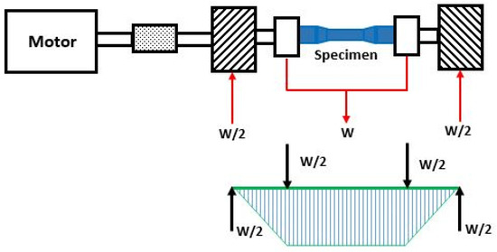 A four-point rotating bending machine was used to carry out the fatigue tests, as shown in Figure 3. The samples were loaded with alternate cycles of tensile and compressive stresses as they were simultaneously bent and rotated. Loads from 10 to 16 kg were applied during the tests, corresponding to an alternating stress (σMAX) in the range of approximately 320 to 460 MPa.