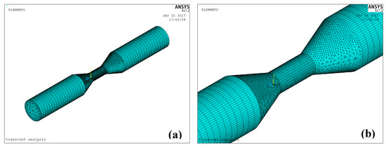A thermo-mechanical numerical simulation was performed to describe the hardening process on the fatigue specimens. ANSYS code (ANSYS, Inc., version 17.2, Canonsburg, PA, USA) was used for the numerical model definition. The simulation first step was the thermal analysis that was carried out by using SOLID70 thermal elements. In the second step of the simulation, starting from the thermal solution, the thermal elements were converted into SOLID185 structural elements. At the end of the simulation, the radial displacement, strain and stress of specimen were evaluated, in order to have the profile of the deformed specimen [30]. An axially symmetric object (standard tensile test specimen), 15 mm in outer diameter, 6 mm in inner diameter, and 116 mm in length, was subjected to the simulation as reported in Figure 4, where the meshes used in both thermal and mechanical calculations are presented. As shown in Figure 4, a finer mapped mesh was used in the area subjected to higher temperatures being directly located below the incident laser heat flux. This approach permits to reduce modelling and solution times.