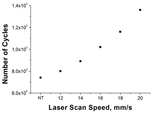 Number of cycles vs. laser scan speed (Laser power = 200 W). NT refers to the untreated samples.