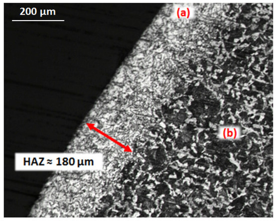 Micrography of a laser hardened cross-section: transition from: (a) martensitic structure to (b) ferrite and perlite structure (Laser power = 200 W and Scan speed = 20 mm/s).