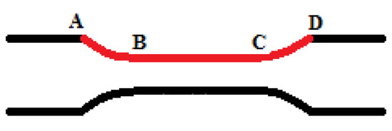 Laser treatments were carried out in order to maintain a constant laser scan speed. Due to the varying section of the sample, its rotating speed was accordingly changed when moving from the largest section zone of the substrate to the smallest one. It is worth to note that all the parameters were chosen to avoid or at least limit the overlapping phenomenon. As shown in Figure 8, each laser treatment started at point A, where the diameter of the specimen is the largest, and continued along the surface of the substrate passing to point B, varying the laser scan speed as mentioned before because of the decreasing of the diameter. Between the points B and C, the diameter is constant, as it is the laser scan speed. Finally, passing from C to point D, the diameter increases, and the laser scan speed is adjusted accordingly. Table 4 reports the interaction time between the laser beam and the specimen at different scan speed obtained along the constant section (i.e., from B to C). In particular, the lower the scan speed the higher the interaction time. It must be noticed that an excessive treatment time lead to the back-tempering phenomenon while a too-short treatment time does not guarantee sufficient heat input required for the martensitic transition.