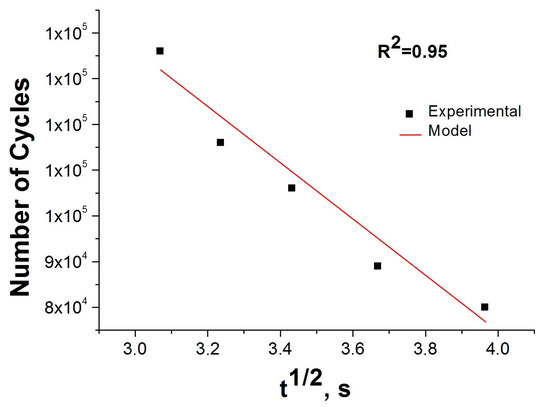 Figure 9 shows the fatigue tests results in terms of number of cycles vs. the square root of laser interaction time with the substrate. The latter term, which is suggested to be proportional to the laser power, as reported in literature [12,32], allows a better understanding of the dependence of the fatigue life from the laser power itself. As expected, the number of cycles decreases as the laser power increases (Figure 9). It has been seen, from the experimental model regression, that there is a dependence of fatigue life endurance from the treatment time according to the following regression model: