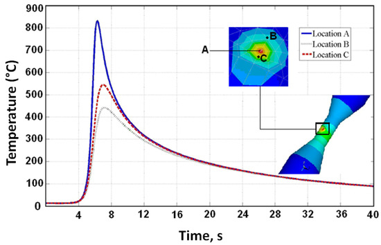Figure 10 shows the temperature over the time for three different points (A, B, C) in a small section of the specimen during the laser treatment process. The peak temperatures were observed in proximity of the heat source position (point A). A high temperature gradient can be observed during the heating step, which is followed by the cooling phenomenon after the maximum temperature is reached.