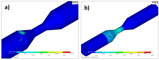 Figure 11 shows the temperature map evolution during the hardening process simulation at two different times: 1.5 and 16 s. The laser scan speed was set at 20 mm/s. The maximum temperature reached is about 850 °C, lower than the melting point of the material (1515 °C). This scenario clearly indicates that all examined points are outside the fusion “window” and in the right thermal conditions for the hardening transition.