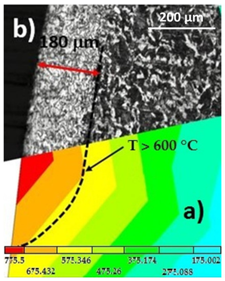 As showed in Figure 12, the FEM model allows identifying the substrate thickness of the workpiece with a temperature profile of greater than 600 °C. This area corresponds to the HAZ zone where there are the thermal conditions for the martensitic transition. Figure 12 shows a good agreement between the simulation (Figure 12a) and experimental results (Figure 12b) being, in both cases, the hardened thickness of about 180 μm. In particular, the simulation predicts a slightly shallower depth for all the scan speed investigated. It must be noticed that the fitting between the numerical model and the experimental data is characterized by a mean absolute error of ~7%. The matching between the FEM model and the experimental data can therefore be considered very good, even if it is compared with data available in the literature [11,24,33].