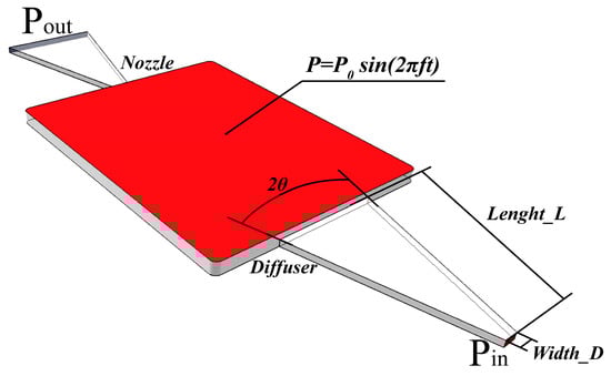 To find a better geometry for the air breathing pump, several simulations were performed using Fluent. The aspect ratio (AR, L/D), diffuser angle (θ), and opening width of the channel (D) are variables in the simulation model shown in Figure 1. The pressure change due to the vibrating PZT actuator was described as a specific user-defined function (UDF) shown in Equation (15) [15]. This UDF was connected to Fluent for the simulation model. The oscillation flow induced by the pressure change could thus be calculated.
