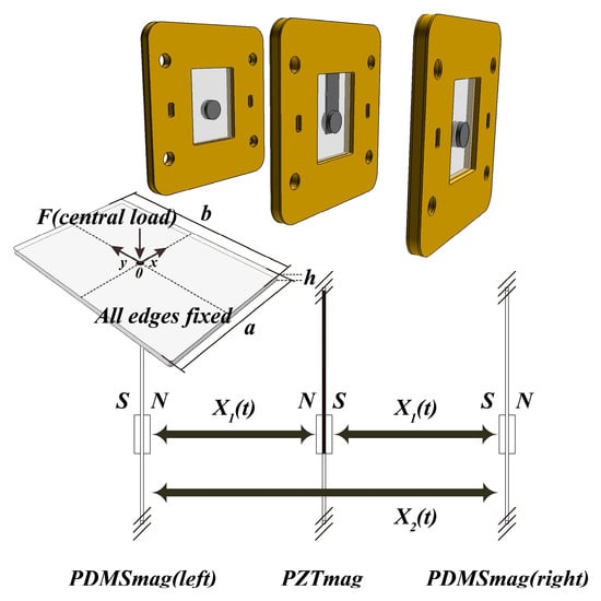 The total force FPDMS(right) applied to the center of the PDMSmag (right) consisted of the repulsive force F(x1) between the PZTmag and the PDMSmag (right) and the attractive force F(x2) between the PDMSmag (right) and the PDMSmag (left):