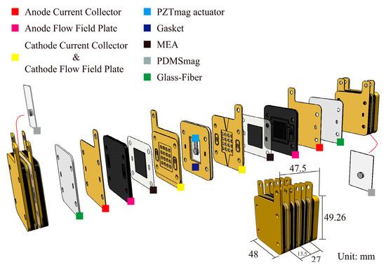 The PZTmag actuator was installed on an acrylic plate and clamped by a gasket. The cathode flow field plate, the MEA, and the anode flow field plate were clamped between the anode current collector layer and the gasket, as shown in Figure 4. The layers were held together by screws instead of glue. Hence, every part of the bi-cell PZTmag–PEMFC stack could be separately changed.