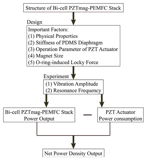 The experiment flowchart of bi-cell PZTmag-PEMFC stack is shown in Figure 5. According to the specifications of the PZT actuator (BM 70/25/200M, Piezomechanik Dr. Lutz Pickelmann GmbH, München, Germany), the maximum operating voltage was 50 V and the operating frequency was below 300 Hz. In this experiment, its proper operation, the PZT actuator was tested at an rms voltage of 10–40 V and a frequency of 15–270 Hz.