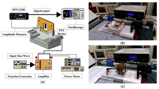 Resonant frequency and amplitude test system of the PZT–PDMS actuator and the PDMSmag. (a) Platform for experimental instruments; (b) Measuring the PZT–PDMS; (c) Measuring the PDMSmag within a stack.