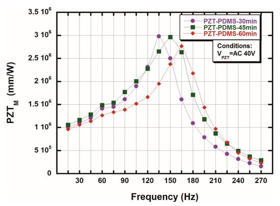 The actuating voltage for the tests was 40 V. All maximum vibrating amplitudes of the PDMS with 30-, 45-, and 60-min curing times were over 1500 μm. However, the power consumption of each design was different because of the varying stiffness and thus, the resonant frequencies. The performance of the PZT (the vibrating amplitude per power consumption for the PZT device) was calculated and is shown in Figure 7. The highest PZTM value was attained with 135 Hz and 40 V when the PDMS with 30-min curing time was used.