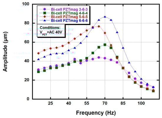 Once all stack components had been assembled, the PZTmag used a magnet 6 mm in diameter, whereas the PDMSmag used magnets of diameters 6 mm, 5 mm, 4 mm, and 3 mm. We used O-rings to prevent the flow field plate from leaking hydrogen. The installation of the O-rings increased the thickness of the stack, which in turn increased the distance between the centers of the air pumps. To fix a distance of 13.5 mm to the center of the air pump, we needed to apply a greater locking force to assemble the stack. Because of the greater force, the PDMS sustained a larger tension force. Therefore, larger magnets were used to strengthen the magnetic force to contend against the larger tension force within the PDMS. This is shown in the experimental results when both the PZTmag and the PDMSmag used magnets 6 mm in diameter. The experimental result for the bi-cell PZTmag–PEMFC stack is shown in Figure 8. In this experiment, a maximum amplitude of 87 μm was produced under operating conditions of 70 Hz and 40 V. The power consumption was 0.03 W.