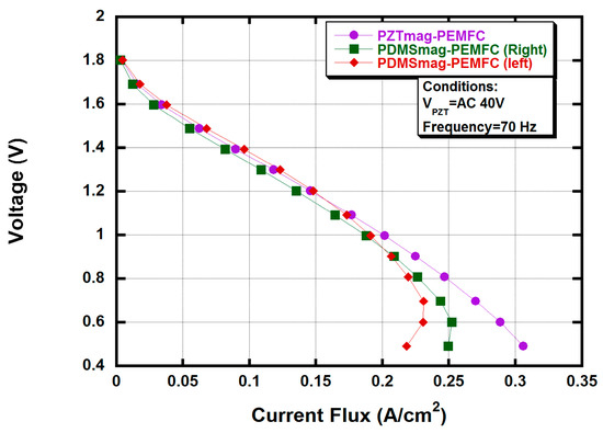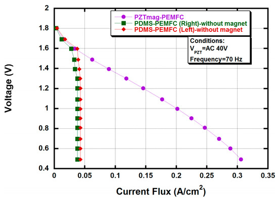 Moreover, the experimental results showed that the I-V curve of the PZTmag-PEMFC was more stable than those of the other two PDMSmag–PEMFCs as shown in Figure 10. This was because the PDMSmag was driven by the PZTmag in only one direction. When the PZTmag pushed in the opposite direction, the PDMSmag returned to its original position because of its own tension. Therefore, the vibration in the PDMSmag was limited, resulting in different amplitudes in the forward and backward directions. A maximum amplitude of 87 μm was produced under operating conditions of 70 Hz and 40 V. Furthermore, because of the smaller amount of air pumped into the chamber, the power generated by the three bi-cells was lower than expected. The maximum power flux outputs were 0.2025 W·cm−2, 0.1888 W·cm−2, and 0.1913 W·cm−2.