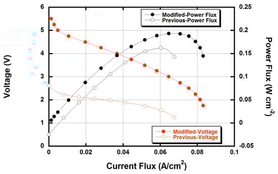 The optimized design (both PZTmag actuator and PDMSmag combined with the magnet of diameter 6 mm) was used to measure the power outputs for certain tests. The power consumption of the PZTmag actuator under a frequency of 70 Hz and voltage of 40 V was 0.03 W, while the power output of the bi-cell PZTmag–PEMFC stack wFas 4.65 W. Thus, the module of the bi-cell PZTmag–PEMFC stack delivered a net power output of 4.62 W (the output in [16] was 3.86 W). The comparison with previously proposed fuel cell stack designs is shown in Figure 11. The maximum net power flux output of the bi-cell PZTmag–PEMFC stack in the series was 0.1925 W·cm−2, compared to 0.1608 W·cm−2 in the previous design [16]. The net power flux output of the stack hence approximately increased by 20%.