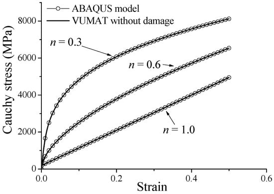 Figure 1 shows the uniaxial stress–strain curves obtained with the elastic–plastic model implemented in the VUMAT subroutine, which are compared with the numerical results given by the built-in elastic–plastic model available in ABAQUS. From these results, one can observe that the uniaxial stress–strain curves given by the VUMAT subroutine coincide with those provided by the built-in ABAQUS model, which demonstrates the successful implementation of the proposed model.