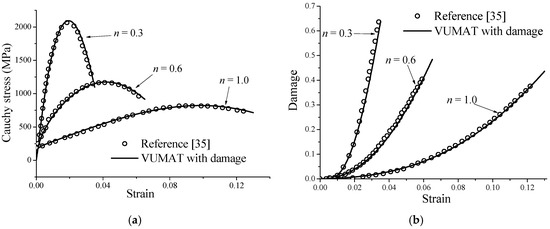 Validation of the numerical implementation of the fully coupled elastic–plastic–damage model with respect to reference solutions taken from [35] for the three studied materials: (a) uniaxial tensile stress–strain curves; and (b) damage evolution.