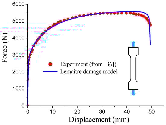 Tensile load–displacement response simulated with the Lemaitre damage model, along with the experimental curve taken from Aboutalebi et al. [36].