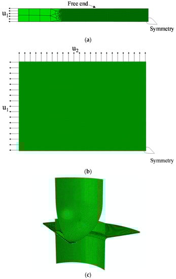 Due to the symmetry of the problem, only one quarter of the geometry is discretized for each specimen. Figure 5 provides an illustration of the finite element models for the simple sheet stretching test and the Erichsen deep drawing test. For the particular case of the simple sheet stretching test, two different types of boundary conditions are considered in the simulations in order to reproduce most of the strain paths encountered in the simulations of the Erichsen deep drawing test with the various specimen widths. The first type of boundary conditions corresponds to a simple uniaxial tension, and these boundary conditions are applied to the specimens having a width ranging from 12 mm to 60 mm (see Figure 5a for illustration on the specimen having a width of 12 mm). The second type of boundary conditions corresponds to a proportional biaxial tension, and these boundary conditions are applied to the specimens having a width ranging from 72 mm to 120 mm (see Figure 5b for illustration on the specimen having a width of 84 mm).