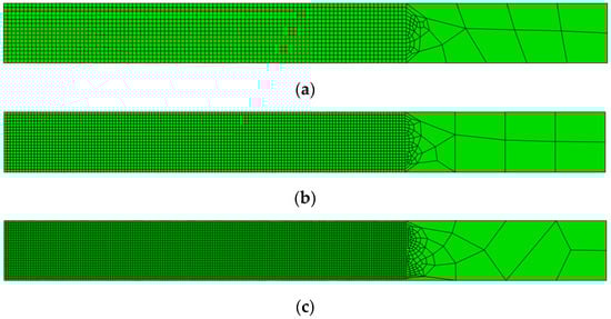 In-plane FE discretization for the central region of the specimen: (a) 0.4 × 0.4 mm2; (b) 0.3 × 0.3 mm2; and (c) 0.2 × 0.2 mm2.