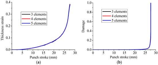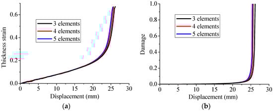 Effect of the number of elements in the thickness direction on the evolution of (a) thickness strain and (b) damage, during the Erichsen deep drawing test for the specimen with 12 mm width.