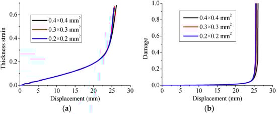 Figure 9 and Figure 10 show the evolution of the thickness strain and damage variable in the center of the specimen, as determined by the present constitutive model with three different in-plane mesh sizes, for the uniaxial tensile test and Erichsen deep drawing test, respectively. In contrast to the results obtained with different numbers of element layers, the predicted thickness strain and damage variable reveal more sensitivity to in-plane mesh refinement when the damage variable becomes significant (i.e., ). More specifically, the numerical results obtained with the intermediate and finer meshes (0.3 × 0.3 mm2 and 0.2 × 0.2 mm2, respectively) are close to each other, which prompted us to use the in-plane mesh of 0.3 × 0.3 mm2 in the subsequent simulations. Indeed, this intermediate mesh involves reasonable computational times for all specimen geometries.