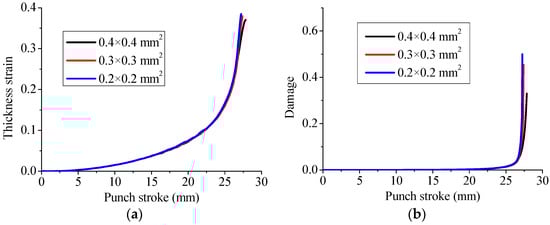 Effect of the in-plane mesh refinement on the evolution of (a) thickness strain and (b) damage, during the Erichsen deep drawing test for the specimen with 12 mm width.