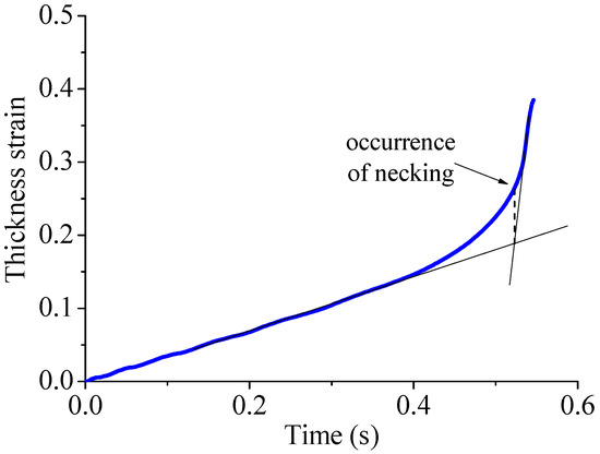 Illustration of the prediction of the occurrence of necking when the thickness strain evolution is taken as indicator.