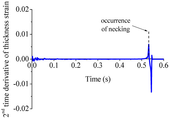 The second numerical criterion is based on the analysis of the thickness strain acceleration, which is obtained by computing the second time derivative of thickness strain in the central region of the specimen (see, e.g., [11,40,42]). According to this criterion, the critical minor and major in-plane principal strains at the occurrence of necking are obtained when the second time derivative of the thickness strain, i.e., thickness strain acceleration, reaches a maximum. This is illustrated in Figure 12 for the uniaxial tensile test corresponding to the specimen having a width of 12 mm. Note that the occurrence of localized necking may also be predicted using the first time derivative of thickness strain, which represents the thickness strain rate. However, several works in the literature have shown that the numerical criterion based on the maximum of strain acceleration is more appropriate for the prediction of localized necking than the one based on the maximum of strain rate, as the latter rather indicates the onset of fracture (see, e.g., [8,9]).