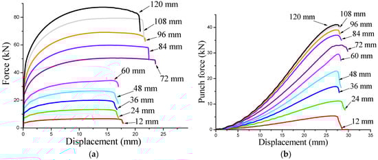 Numerical load–displacement curves for (a) the simple sheet stretching test and (b) the Erichsen deep drawing test with the various specimen widths.