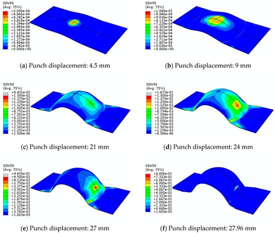 For the Erichsen deep drawing test, the damage distribution is localized around the dome apex of the specimen (i.e., higher specimen point) in the early stages of the deep drawing process, with low damage levels (i.e., , see Figure 16a,b). As the punch moves down, a strong localization of damage distribution is observed far from the dome apex, which is due to the frictional contact between the punch and the specimen (see Figure 16d,e). Finally, the damage accumulation leads to localized necking followed by fracture, as shown in Figure 16f.