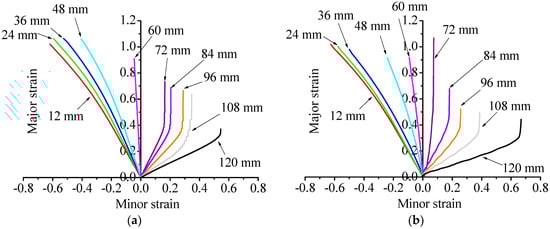 The strain paths generated by the simulations of the simple sheet stretching test and the Erichsen test for all specimen widths are reported in Figure 17. Similar trends for the strain-path evolution are observed between both tests. More specifically, the strain paths are almost linear for the specimens having widths ranging from 12 mm to 60 mm (i.e., corresponding to a negative minor strain), while they are clearly nonlinear for the specimens having widths ranging from 72 mm to 120 mm (i.e., corresponding to a positive minor strain). In the latter case, the strain paths remain linear until a sudden transition to some plane-strain state, which indicates the onset of localized necking (see, e.g., [40,43]).