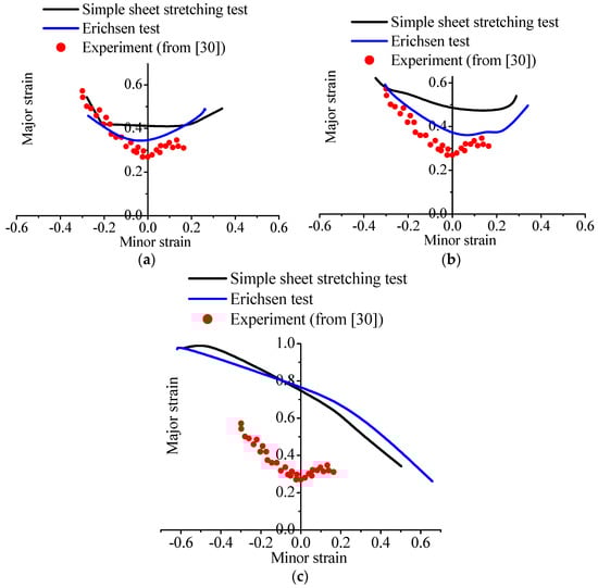 Figure 18 compares the predicted FLDs for the studied material, based on the simulations of both simple sheet stretching and Erichsen tests, along with the experimental results provided by Aboutalebi et al. [30]. The FLDs based on the analyses of thickness strain, second time derivative of thickness strain, and critical damage threshold are presented in Figure 18a–c, respectively.