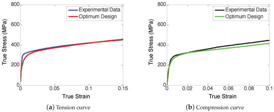 True strain-true stress curve comparison of experimental data and optimum design for Ti-7Al. (a) Tension curve; (b) Compression curve.