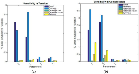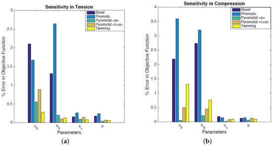 According to the sensitivity results shown in Figure 7, the most critical slip systems are determined as the basal and prismatic slip systems. The objective function values are also more sensitive to the changes in and parameters rather than the changes in and a in both tension and compression. The tension test is sensitive to both basal and prismatic slip systems, however, in compression, the prismatic slip system is determined to be more effective. Twinning was expected to be active during compression, and as the sensitivity results indicate it becomes more effective in the compression test. After basal and prismatic slip systems, the third most dominant slip system is found to be pyramidal in tension, and it is followed by pyramidal and finally by twinning. However, the third most dominant system is twinning in compression. This also clearly indicates the necessity of including twinning in crystal plasticity modeling of Ti-Al alloys.