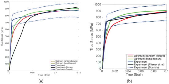 Similarly, the true stress-true strain curve results in Figure 4 indicates an accurate computational representation to the available tension and compression experimental data. The initial texture uncertainties affect the computational result as the difference between the computational and experimental stresses is larger when the strain has smaller values. However, the effect of initial texture uncertainties is not important when the strain has higher values as shown in Figure 4. The different experimental data with basal initial textures are shown. Fitzner and Fitzner et al. data in Figure 4 was obtained from References [,] in Figure 4. Please note that the experimental plots given by Fitzner [] and Fitzner et al. [] show the Al concentration in terms of the at %. Ti-7Al alloy of interest in this study has 7 wt % Al. Therefore the experimental curves provided by Fitzner [] and Fitzner et al. [] for Ti-13 at % Al is used for the comparison (Ti-13 at % Al ≈ Ti-7.3 wt % Al). The uncertainty bounds of the aforementioned measurements (three measurements in tension and 21 measurements in compression test) and the experimental data available in literature (Fitzner [] and Fitzner et al. []) clearly indicate how the stress-strain behavior can be affected by the measurement uncertainties as shown in Figure 4. To understand the initial texture uncertainties better, a simulation is also performed by inputting a basal initial texture and using the same optimum slip system parameters, and the simulation result with the basal initial texture in Figure 4 provides a better match to the experimental data as expected.