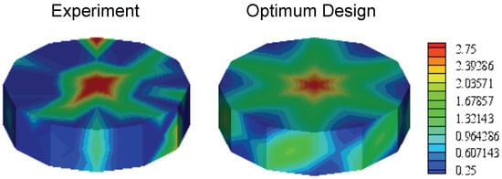 The sensitivities of the optimum parameters to the tension and compression design objectives (min and min respectively) are investigated using sample points generated with Latin Hypercube Sampling (LHS) []. Ten sample points per each variable, and therefore 200 sample points in total are generated. Each parameter is assumed to vary up to % around its optimum value with a Gaussian distribution, and the others remain constant at their optimum values. The sensitivities are represented as a percent bar graph in Figure 3 which shows the average % change in the design objective given up to 10% changes around the optimum values of the variables. The sensitivity analysis is performed for both tension and compression tests.