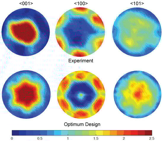 In Equation (3), and show the norm errors between true stress points of the experimental data and ODF simulation for tension (denoted by t) and compression (denoted by c) tests. The experimental data is available up to strain, and therefore the ODF simulations are performed for the same strain level. The strain rate is defined as , and a quadratic interpolation is implemented to match the experimental and computational strain points. In Equation (4), s shows the vector representation of 20 optimization variables for five slip systems.