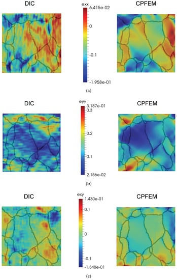 CPFE simulation and SEM-DIC data comparison for , and strain fields. (a) strain field; (b) strain field; (c) strain field.